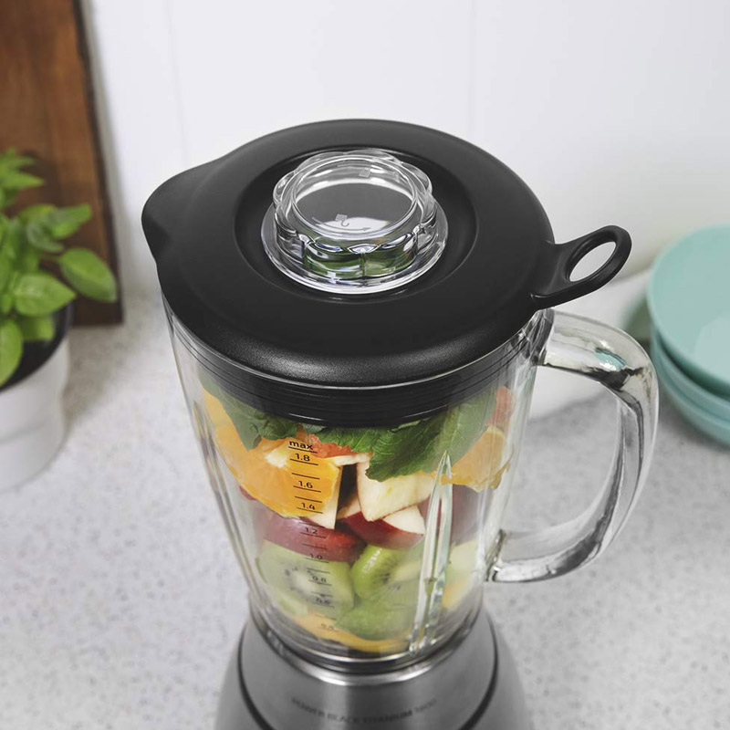 Το μπλέντερ, είναι εξοπλισμένο με λεπίδα 6 φύλλων με μαύρη επίστρωση τιτανίου υψηλής ποιότητας, που θα σας επιτρέψει να αξιοποιήσετε στο έπακρο όλες τις θρεπτικές ουσίες των τροφίμων και να αποκτήσετε τις καλύτερες υφές. Το μαύρο τιτάνιο βελτιώνει την σκληρότητα από το ατσάλι, διατηρώντας έτσι τις λεπίδες αιχμηρές για μεγαλύτερο χρονικό διάστημα και με καλύτερα αποτελέσματα. Η κανάτα του έχει χωρητικότητα 2.1 Lt και είναι κατασκευασμένη από λιωμένο γυαλί υψηλής αντοχής, ανθεκτική στις θερμικές διαταραχές, ώστε να μην χρειάζεται να ανησυχείτε όταν φτιάχνετε ζεστές κρέμες ή ψιλοκομμένο πάγο, ενώ πλένεται στο πλυντήριο πιάτων.