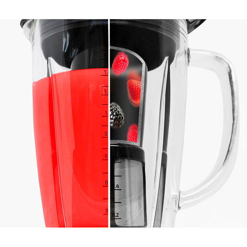 Περιλαμβάνει ένα ειδικό φίλτρο για τέλεια smoothies, ιδανικό για να φτιάχνετε τους καλύτερους χυμούς χωρίς πολτό. Με μία μόνο κίνηση θα έχετε νόστιμους χυμούς, έτοιμους να τους απολαύσετε άμεσα. Το καπάκι του με αεροστεγή σφράγιση προστατεύει από τις λεπίδες και από την εκτόξευση των υλικών, ενώ διαθέτει άνοιγμα με καπάκι δοσολογίας για την εισαγωγή μικρών συστατικών που πρέπει να προσθέσετε κατά τη λειτουργία, ανάλογα με τη συνταγή. Επιπλέον, μπορείτε να χρησιμοποιείτε την κανάτα χωρίς να το αφαιρέσετε, καθώς το φίλτρο παραμένει στη θέση του για να αποφύγετε τον πολτό των φρούτων να πέσει στον χυμό σας.